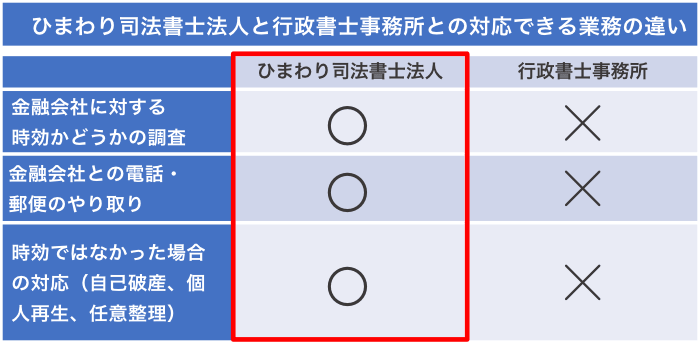 しかし、そのような場合でも安心してください。ひまわり司法書士法人は、時効援用ができない場合でも、あなたの状況に合わせて自己破産、個人再生、任意整理などの他の方法であなたを守ります。なお、最近では時効援用を打ち出している行政書士事務所も多いですが、ひまわり司法書士法人と他の行政書士事務所は対応できる業務について以下のような違いがありますので、ご注意ください。